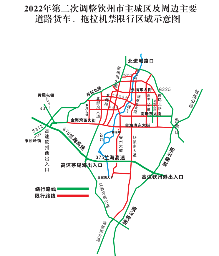 为优化城市货车、低速汽车、拖拉机通行管理,减少城市核心区域空气污染和扬尘发生,维护主城区道路交通有序、安全、畅通,根据《中华人民共和国道路交通安全法》等法律、法规规定,决定自2022年11月14日起对钦州市主城区及周边主要道路货车、低速汽车、拖拉机限行区域实行调整,现将有关事项通告如下:新能源汽车,环卫、园林、通讯、供电、道路养护的各种专项作业车辆,军用货车、警用货车、消防车、垃圾清运车辆以及持限行区域通行码(通行证)的车辆除外。钦江大桥(一桥)、永福大桥(二桥)、子材大桥(四桥)、北环大桥(五桥)24小时禁止限行车辆通行。限行车辆在以下区域和路段每天6:00至21:00限行,其余时段除禁行路段外不限行。(一)国道G325线(进港公路交叉口至钦州湾大道交叉口路段)以西的市区道路限行(不含前述线路)。(二)国道G325线与钦州湾大道交叉口-钦州湾大道-钦州湾大道与西环北路交叉口-西环北路以南的市区道路限行(不含前述线路)。(三)西环北路与南珠西大街交叉口-南珠西大街-南珠西大街与乘风大道交叉路口-乘风大道以东的市区道路限行(含前述线路)。(四)金海湾东大街与进港公路交叉口-金海湾东大街-金海湾大桥-金海湾西大街-金海湾西大街与西环路交叉口以北的市区道路限行(含前述线路)。(九)南珠东大街的国道G325路口至蓬莱大道路口的路段不限行;望州北路全段不限行。限行车辆在预留夜间通行时间(21:00至次日6:00)内无法满足通行需求的,且确因在限行区内生产、生活、重点工程建设等运输的需要,可在钦州市民服务中心(金海湾东大街8号)通行码(通行证)办理窗口免费向市公安局交通警察支队申办通行码(通行证),获批通行码(通行证)后按指定的时间、线路等要求通行。请广大交通参与者注意交通信号变化,自觉遵守道路交通安全法律法规,对违反通行规定的,公安机关交通管理部门将对违法人依法予以处罚。附件:2022年第二调整钦州市主城区及周边主要道路货车、拖拉机禁限行区域示意图