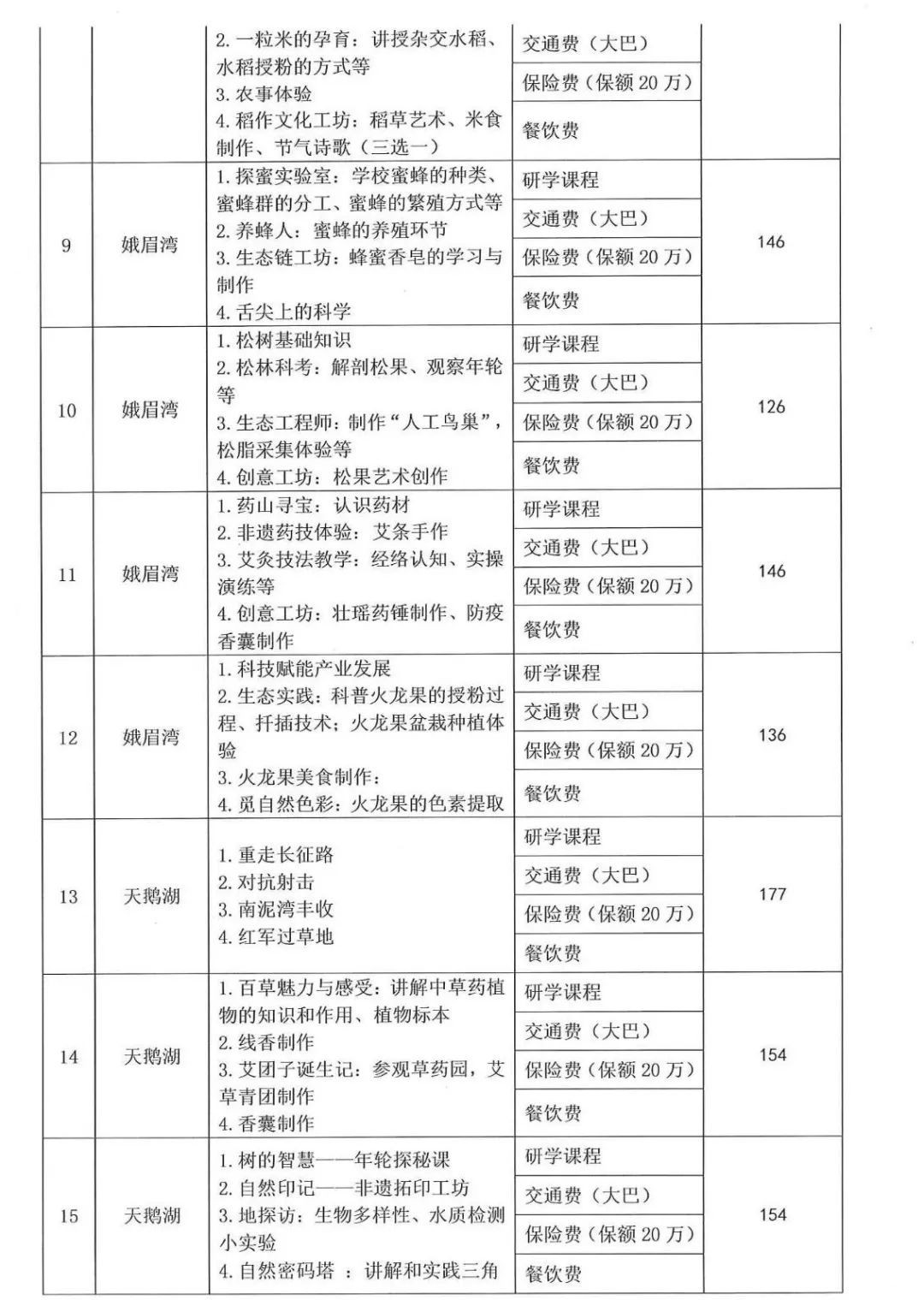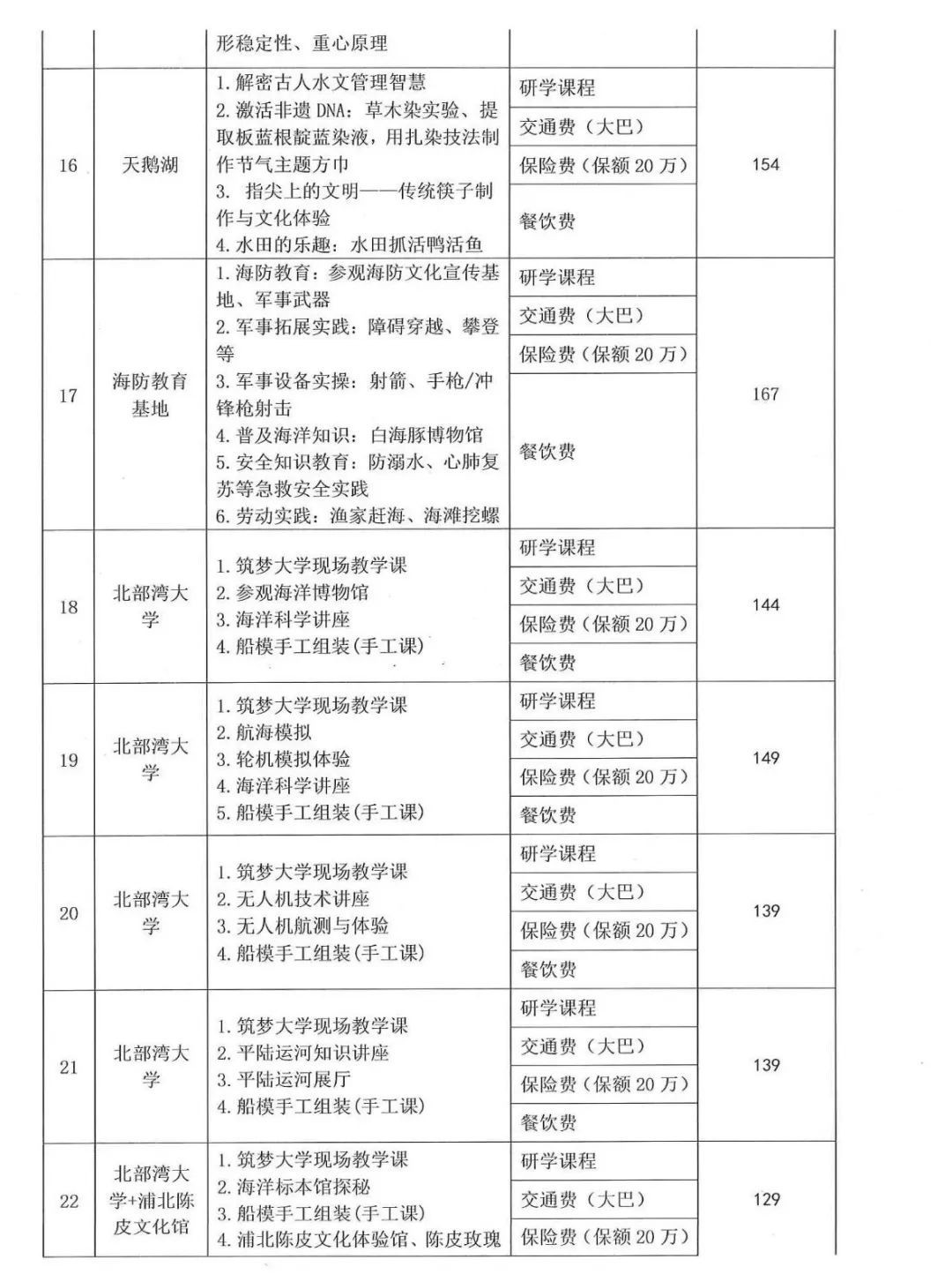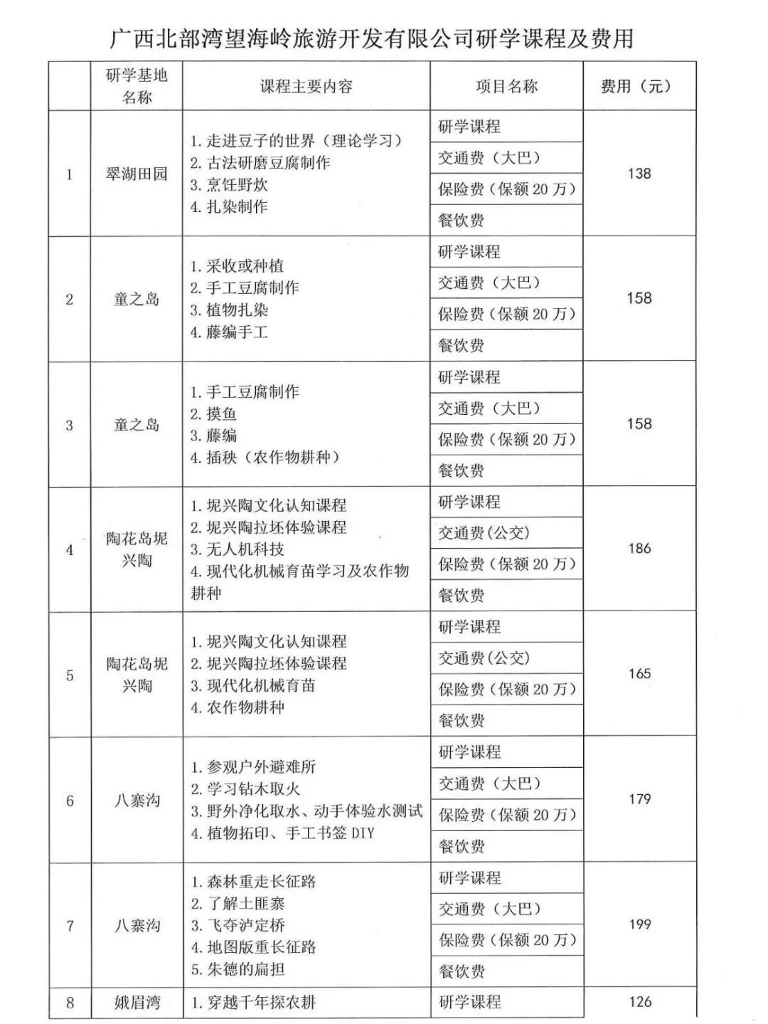 根据广西壮族自治区教育厅及市教育局《关于进一步规范中小学生研学实践教育工作的通知》、钦北区教育局《关于钦北区中小学生研学实践教育工作实施方案(试行)》的通知等文件精神,严格按照文件要求规范研学课程及收费行为,按照钦北区人民政府批示从学生角度出发,价格要合理亲民的要求,我公司将严格按照研学费用的公开透明、明码标价的方式,面向社会公开公示,接受社会监督,现将首批的研学课程及费用公示如下: