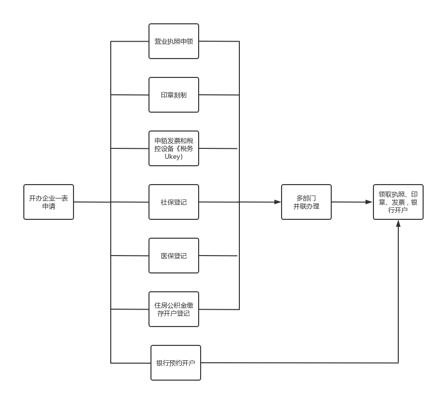 1.开办流程。行政审批、市场监管部门办理企业登记,办结后将信息同步推送至印章刻制机构刻制印章,税务部门完成初次领用发票,社保、登记、公积金开户及银行预约开户,企业开办流程实现2个环节、7个事项、1个工作日内办结