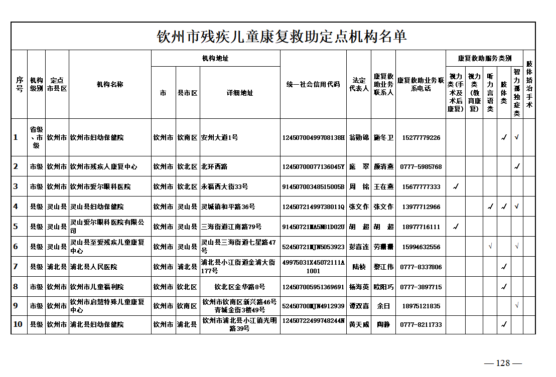 钦州市残疾儿童康复救助定点机构名单