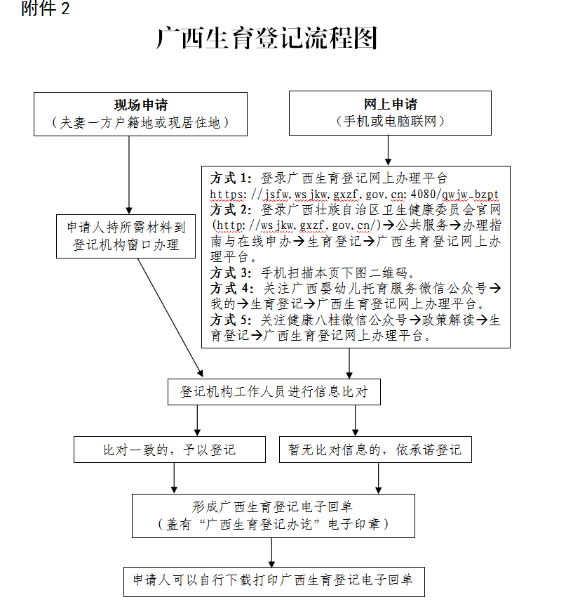 (二)登记方式。推行电子化生育登记。生育子女的夫妻可以通过广西生育登记网上办理平台办理生育登记,也可以到夫妻一方户籍所在地或者现居住地的登记机构现场办理生育登记。