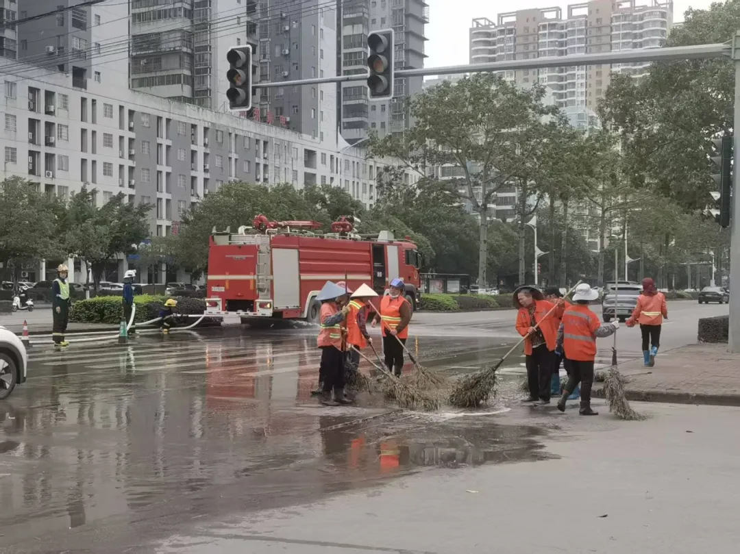 此次行动中,共出动消防车12车次、环卫扫地车9车次,组织环卫工人60余人,重点对约5.4公里路段、67000平方米路面进行深度清洁。作业现场,消防员利用消防车高压水枪对路面油污、积尘及人行道缝隙进行强力冲洗,环卫工人则配合使用大扫帚、高压水枪等工具,对路缘石、绿化带边角等卫生死角进行精细化清理,人机协同形成保洁合力。经过连续作业,原本附着在路面的泥沙、污渍被彻底清除,道路恢复干净整洁的本色,有效提升了城市主干道的环境卫生质量。