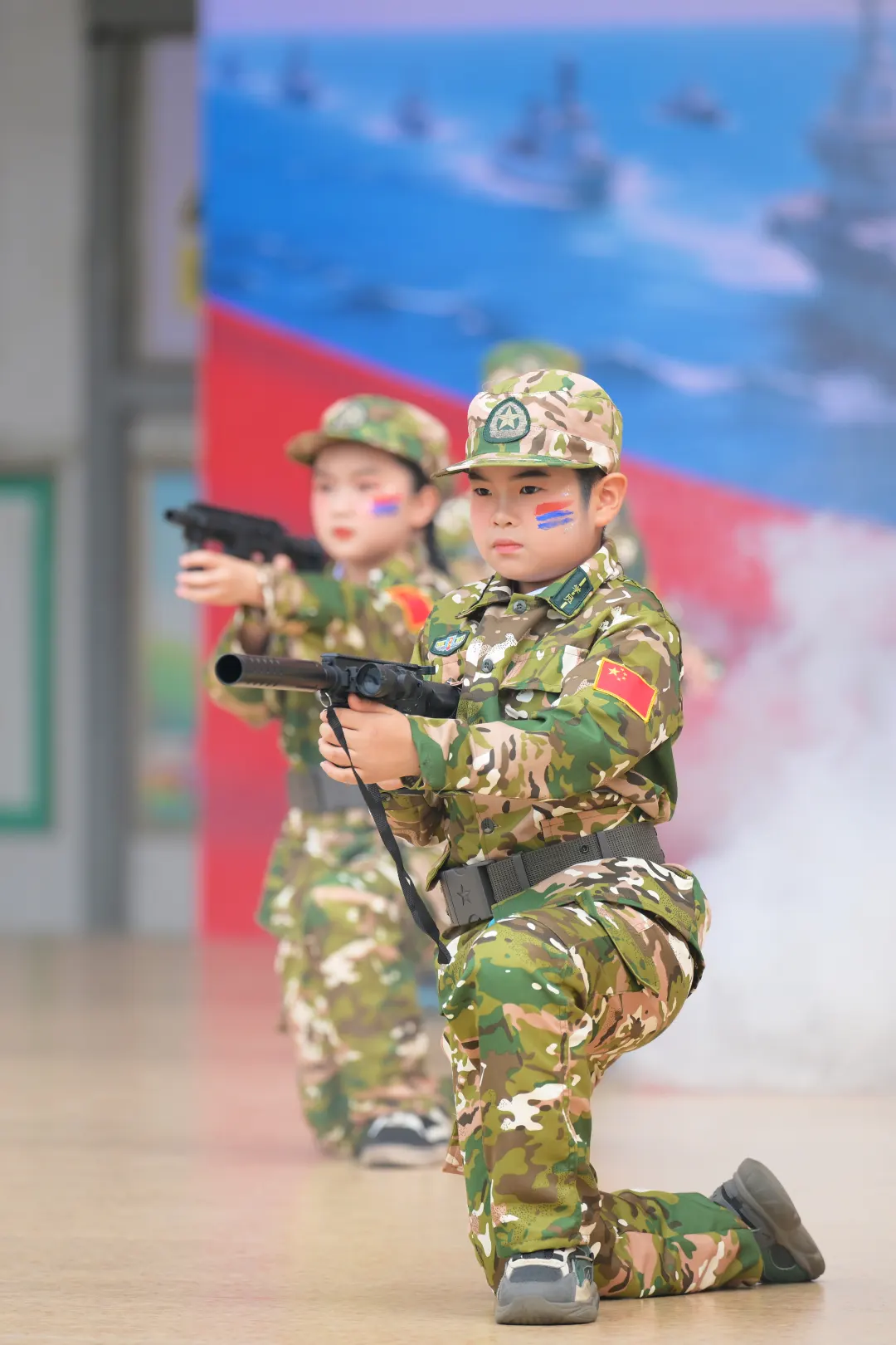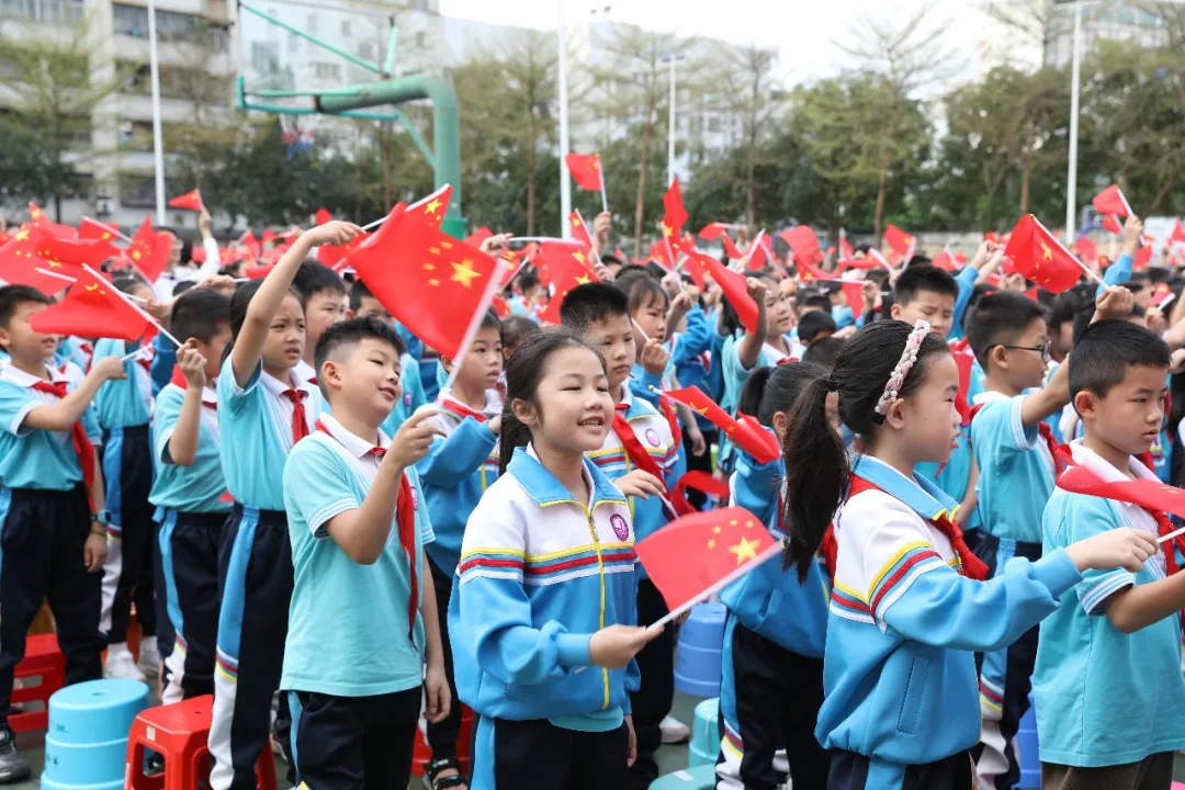 当天上午8:30,活动在气势恢宏的开场舞《少年军梦》中拉开序幕。孩子们身着迷彩,用刚劲有力的舞姿演绎生动演绎了对军营生活的向往和对国防力量的深刻理解,瞬间点燃了全场的热情。紧随其后,在雄壮的国歌声中,鲜艳的五星红旗冉冉升起,全体师生肃立敬礼,高唱国歌。