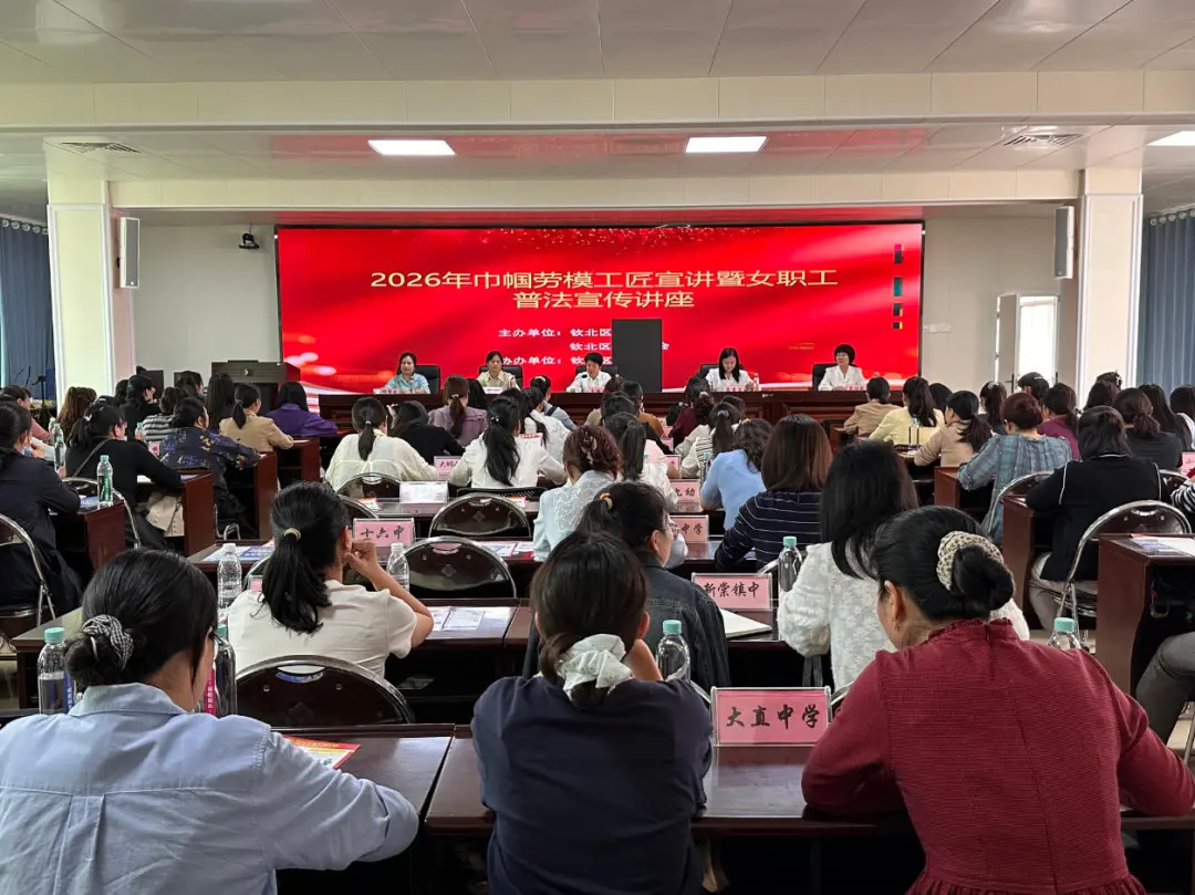 为进一步弘扬劳模精神、劳动精神、工匠精神,增强广大女教职工的法治意识和维权能力,3月26日,钦北区总工会联合钦北区教育工会、钦北区司法局举办2026年巾帼劳模工匠宣讲暨女职工普法宣传讲座。本次活动特邀自治区五一劳动奖章获得者、子材小学党支部书记黎相艳和广西环洋律师事务所专职律师胡循超作宣讲。来自全区教育系统的110名女教职工参加了本次活动。
