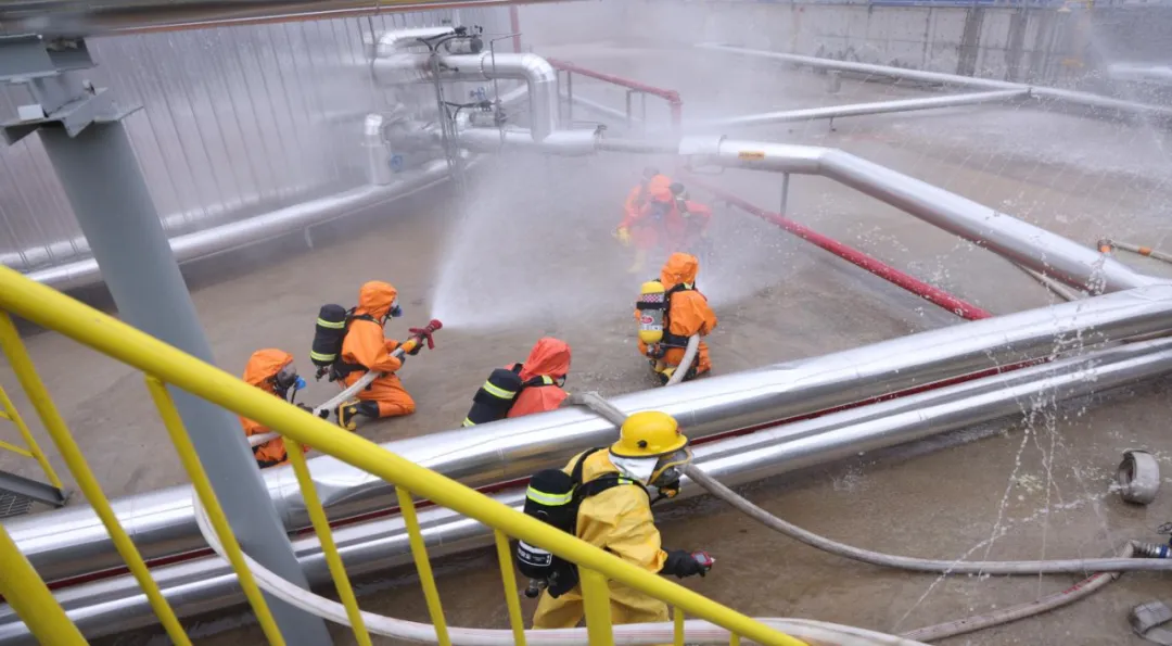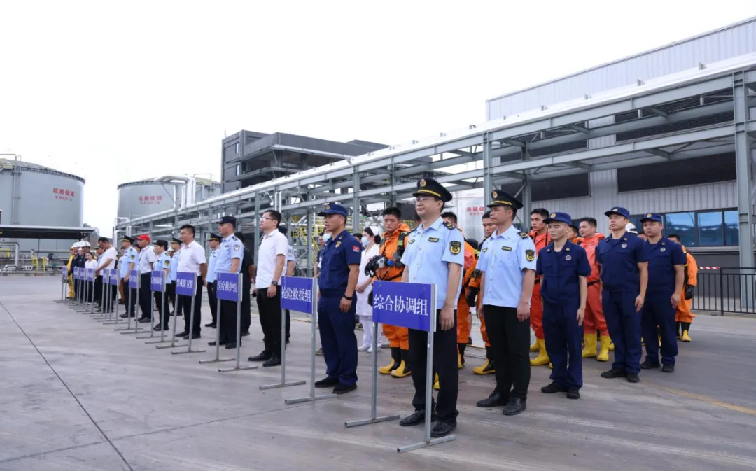 启动仪式结束后,随即展开了应急演练。本次应急演练模拟广西致远实业有限责任公司液硫储罐法兰泄漏引发火灾的突发事故:液硫储罐区V0501A罐在维修作业时,罐底出口管线根部法兰发生泄漏,导致1名工人被液硫烫伤,液硫泄漏碰到检修切割火花引发火灾,事发后企业立即启动Ⅰ级响应,钦北区各应急救援单位接警后启动应急响应处置。演练中,在应急管理、消防、交警、卫健、环保等部门分工负责、密切配合,协同完成交通管制、伤员转运、环境监测、火情扑救等关键任务,经处置,明火扑灭、泄漏封堵、环境达标,演练取得预期效果。