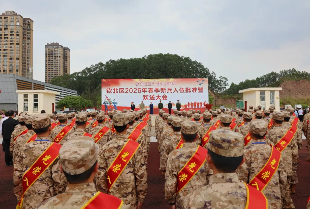 3月13日,钦北区2026年春季新兵入伍批准暨欢送大会在钦北区皇马广场召开,新兵们身着迷彩服,胸佩大红花,精神抖擞,整装待发,准备奔赴军营,开启崭新的人生旅程。区委副书记、区长邓洁丽出席并为新兵致欢送词,寄语入伍新兵不负厚望,用实际行动为国争光,为家乡添彩。