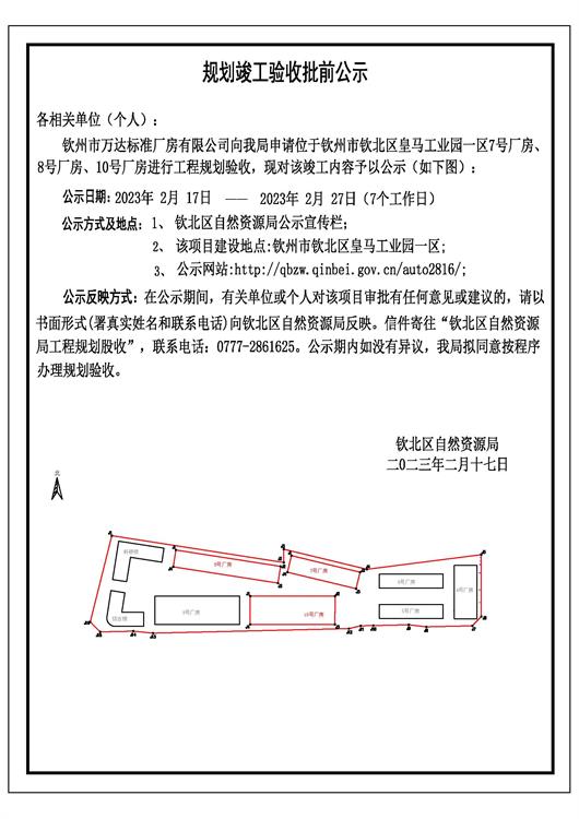规划竣工验收批前公示(钦州市万达标准厂房有限公司7号厂房、8号厂房、10号厂房)