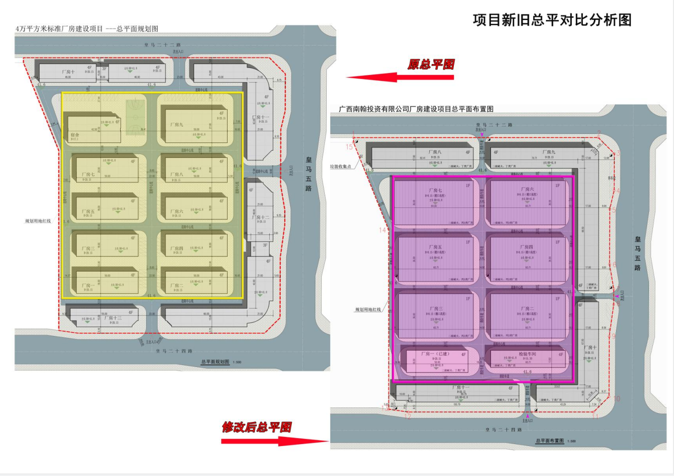 广西南翰投资有限公司厂房建设项目位于皇马工业园一区内。现该公司向我局提交总平面图及建筑设计方案调整,主要调整方向如下: