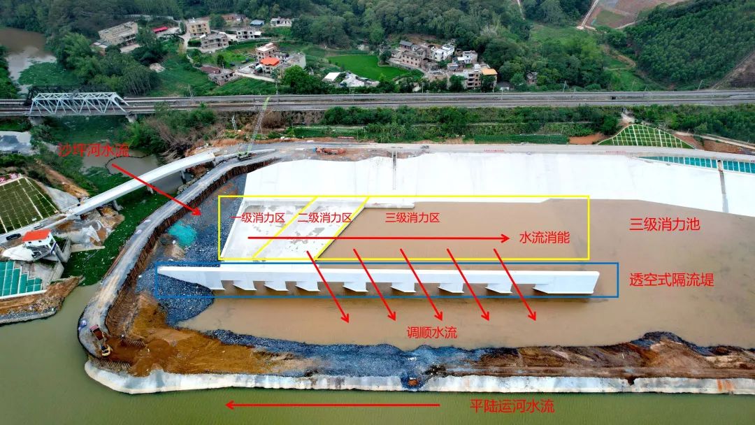 据了解,沙坪河入汇河段具有入汇角度大、支干汇流比大、河底落差大等特点,支流洪水汇入平陆运河后横向流速较大,容易产生漩涡,对航道内船舶航行造成影响。沙坪河支流口工程采取“隔流堤+消力池+沉沙池”的措施,实现“调顺水流+消能+减淤”功能,有效缓解沙坪河水汇入航道时的横向冲击,保证通航后船舶在航道内平稳行驶,并减少航道内泥沙淤积。