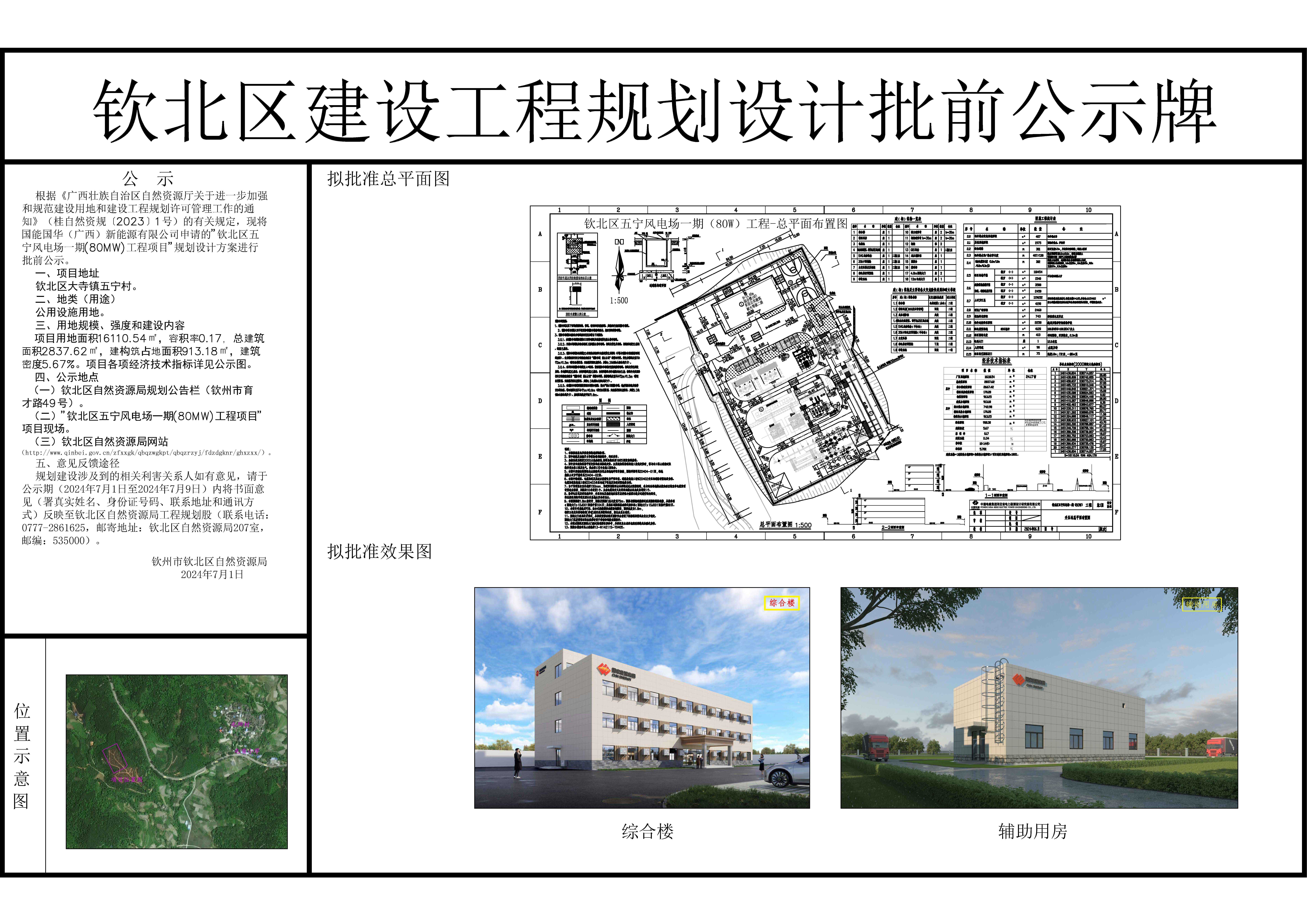 根据《广西壮族自治区自然资源厅关于进一步加强和规范建设用地和建设工程规划许可管理工作的通知》(桂自然资规〔2023〕1号)的有关规定,现将国能国华(广西)新能源有限公司申请的“钦北区五宁风电场一期(80MW)工程项目”规划设计方案进行批前公示。