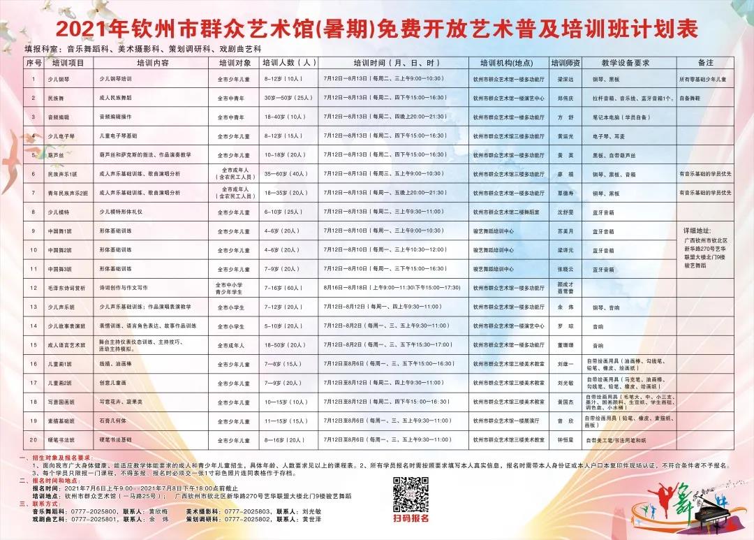 线上报名:2021年7月5日发布公告, 2021年7月6日早上9:00开始报名,报名时间截至7月8日下午18:00前,学员可关注“钦州市群众艺术馆”微信公众号或网站点击暑期培训班报名窗口进行报名。