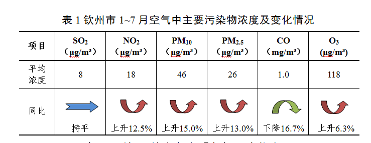 2023年1~7月,钦州市环境空气质量优良天数比例为98.6%,同比上升1.0个百分点;轻度污染天数占比1.4%。环境空气质量综合指数为2.97,同比升高0.22。PM10平均浓度为46微克/立方米,同比升高15.0%。PM2.5平均浓度为26微克/立方米,同比升高13.0%。O3日最大8小时滑动平均值的第90百分位数浓度为118微克/立方米,同比升高6.3%。