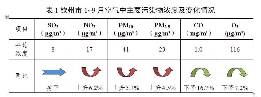 2023年1~9月,钦州市环境空气质量优良天数比例为98.9%,同比上升1.5个百分点;轻度污染天数占比1.1%。环境空气质量综合指数为2.77,同比下降0.03。PM10平均浓度为41微克/立方米,同比升高5.1%。PM2.5平均浓度为23微克/立方米,同比升高4.5%。O3日最大8小时滑动平均值的第90百分位数浓度为116微克/立方米,同比下降7.2%。