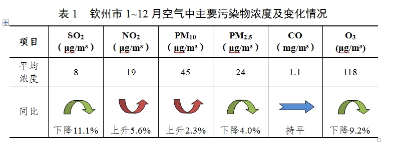 2023年1~12月,钦州市环境空气质量优良天数比例为98.9%,同比上升1.9个百分点。环境空气质量综合指数为2.96,同比下降0.07。PM10平均浓度为45微克/立方米,同比上升2.3%。PM2.5平均浓度为24微克/立方米,同比下降4.0%。O3日最大8小时滑动平均值的第90百分位数浓度为118微克/立方米,同比下降9.2%。