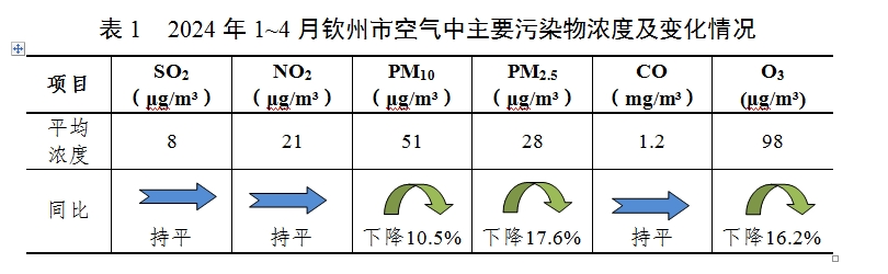 2024年1~4月,钦州市环境空气质量优良天数比例为99.2%,同比上升1.7个百分点。环境空气质量综合指数为3.09,同比下降10.7%。可吸入颗粒物(PM10)平均浓度为51微克/立方米,同比下降10.5%。细颗粒物(PM2.5)平均浓度为28微克/立方米,同比下降17.6%。臭氧(O3)日最大8小时滑动平均值的第90百分位数浓度为98微克/立方米,同比下降16.2%。