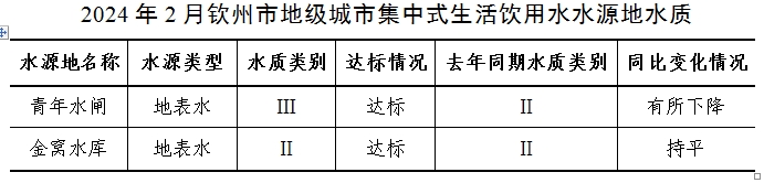 2024年2月钦州市城市集中式生活饮用水水源水质状况报告