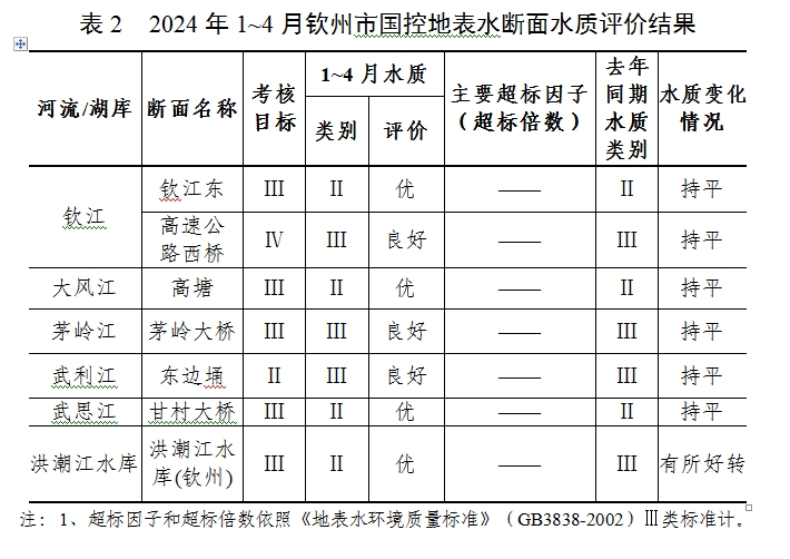 2024年1~4月钦州市国控地表水断面水质评价结果详见下表。