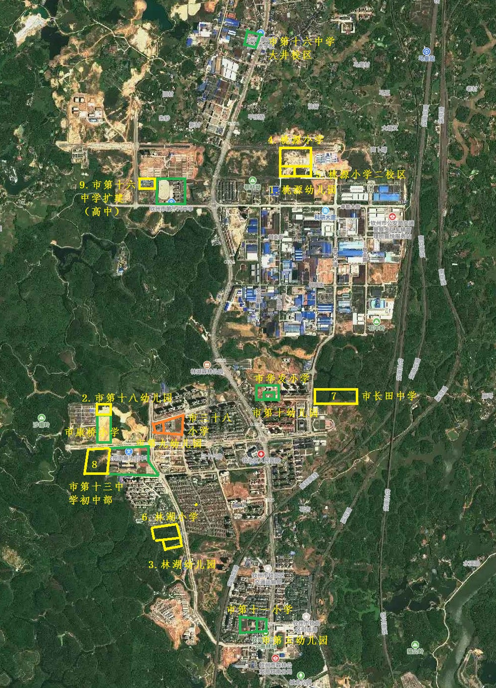(九)市十六中扩建。选址位于市十六中西面,与市十六中连成一体,占地27亩,按标准规划15个高中班,学位750个。随着城镇化的发展,为提升城市品质,我区急需建设一所城区示范性高中。受规模限制,现有十六中条件、特别是用地指标难以达到要求,将初中部分流至市十中、十三中和长田中学,现有校舍只用于举办高中并将学校规模从42个班增加到50个班左右,是举办示范性高中的必要,也是为今后我区普及高中教育打好基础。