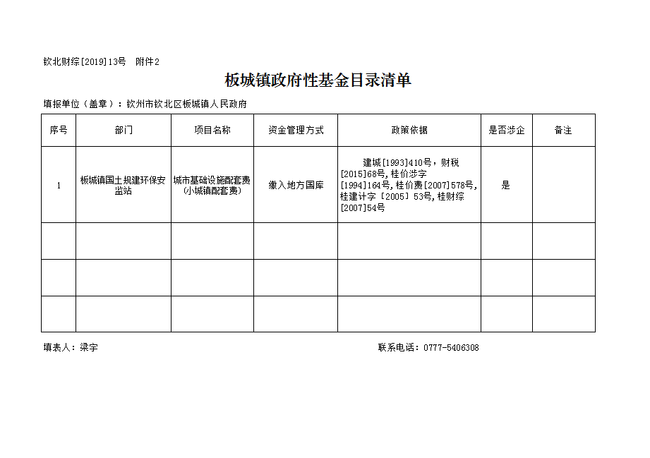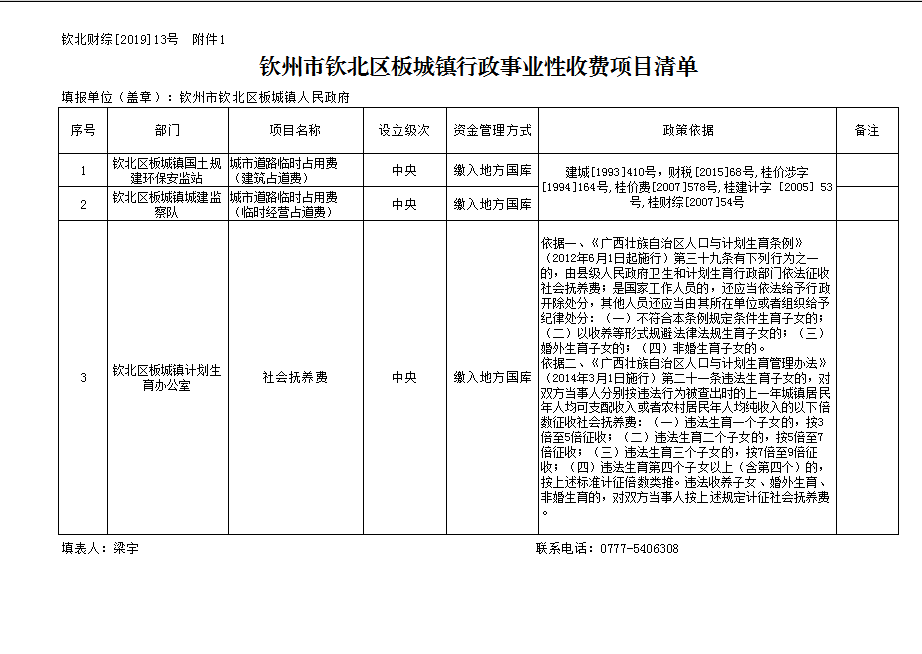 钦州市钦北区板城镇行政事业性收费项目以及政府性基金目录清单