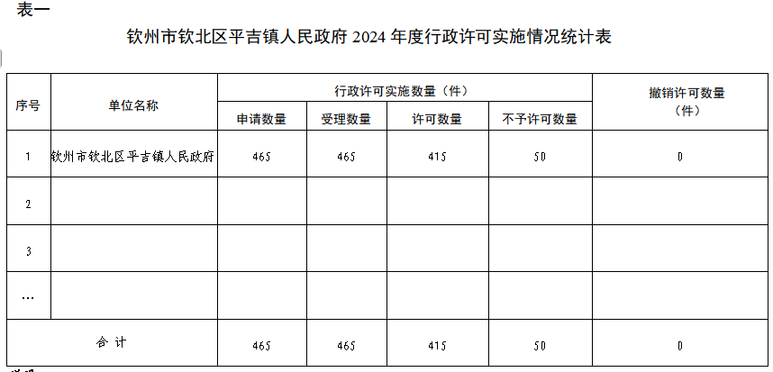 钦州市钦北区平吉镇人民政府行政执法数据统计年报表