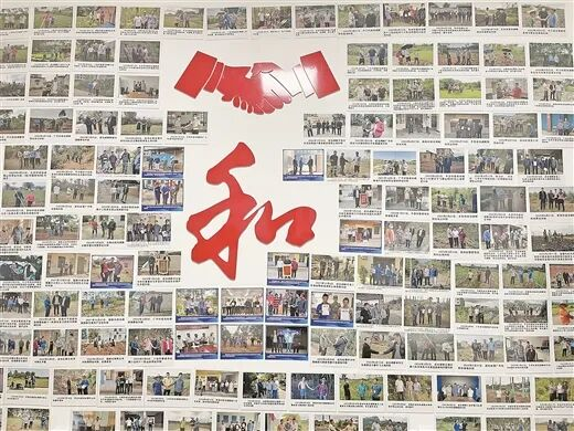 400多张群众握手言和的相片贴满了平吉镇综治中心“握手哥”调解工作室“和”字墙面