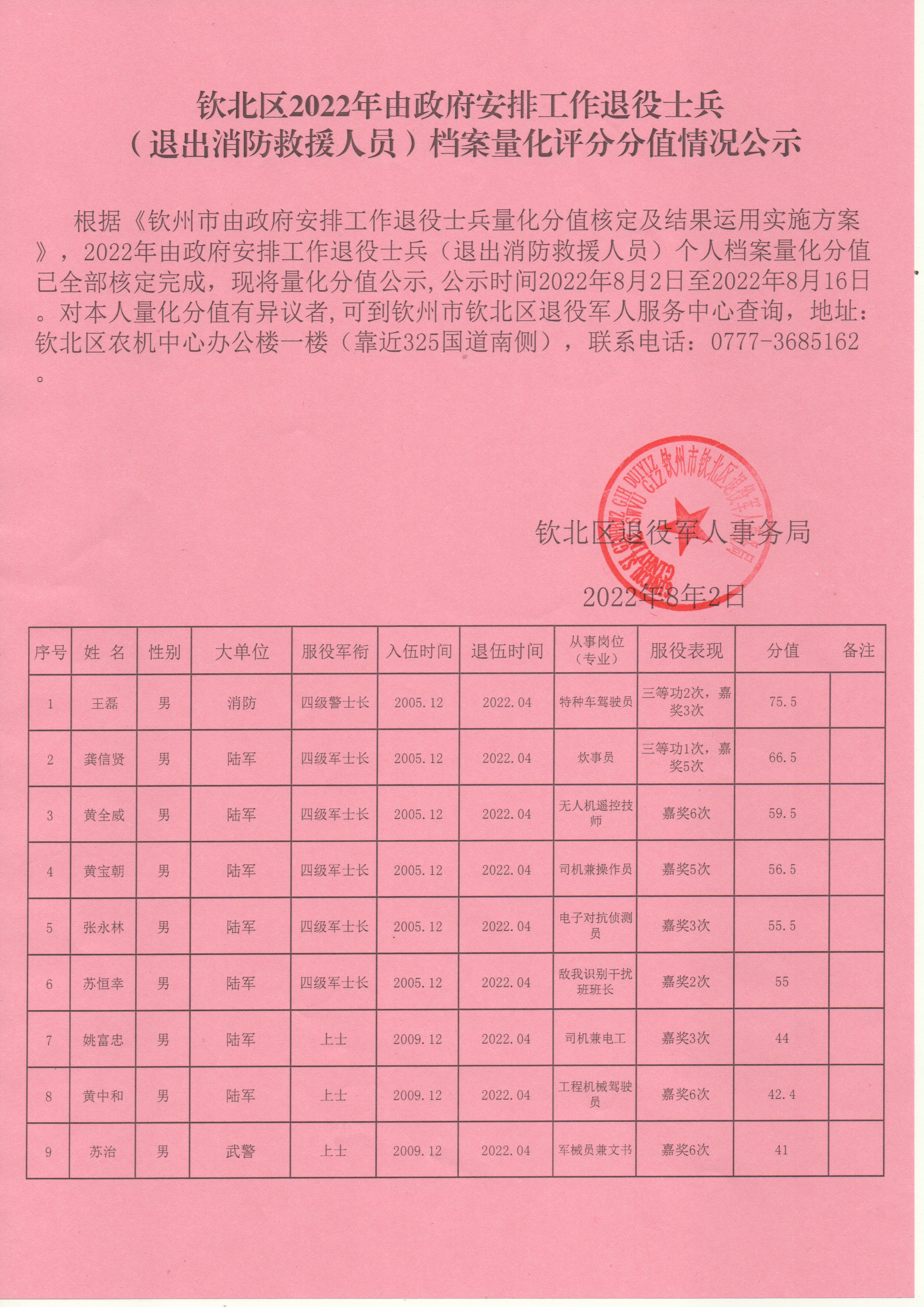 钦北区2022年由政府安排工作退役士兵(退出消防救援人员)档案量化评分分值情况公示