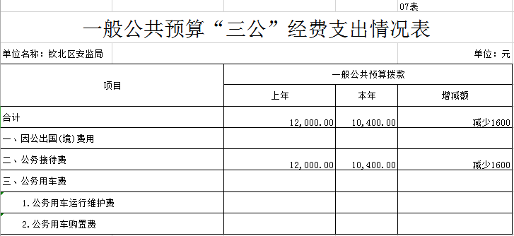 2019年一般公共预算安排的“三公”经费支出预算1.04万元,比2018年预算1.2万元减少0.16万元,同比下降13.33%。2019年一般公共预算安排的“三公”经费减少的原因主要是项目经费按财政文件要求减13.3%。