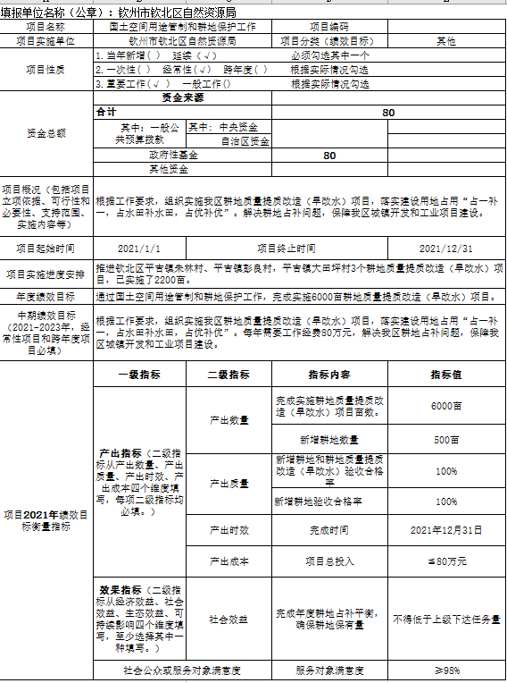 钦北区自然资源局2021年度部门预算钦北区绩效目标申报表