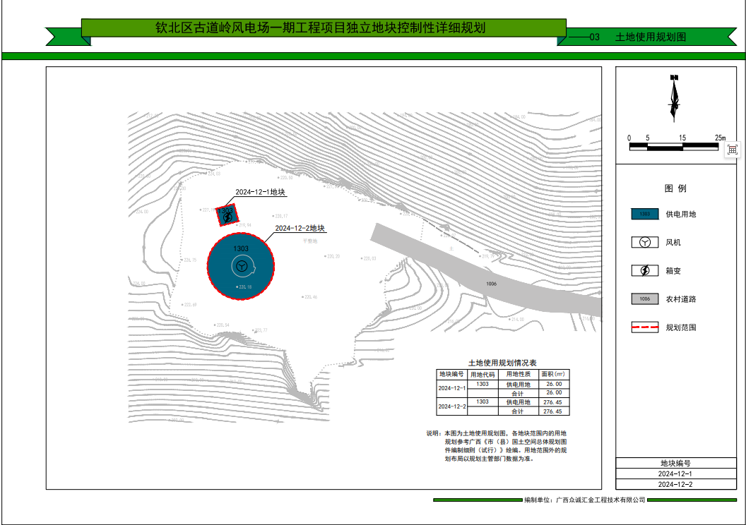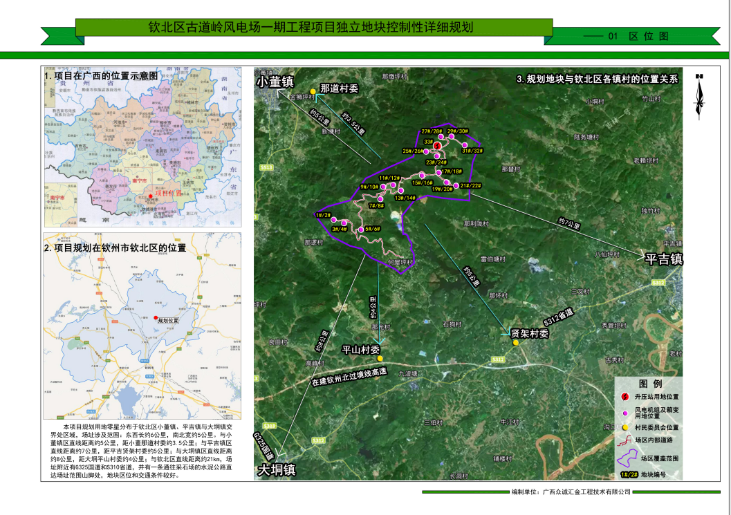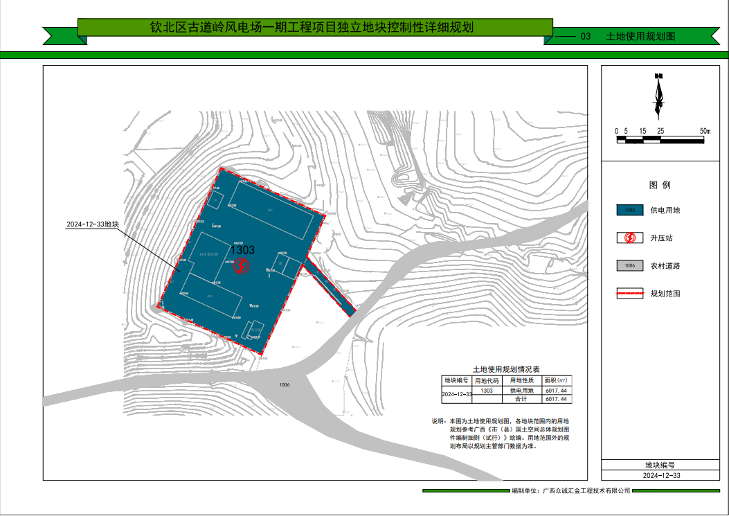 钦北区古道岭风电场一期工程项目位于钦北区小董镇、平吉镇、大垌镇交界处区域,共涉及33个地块,总用地面积合计10904.7平方米(折合16.3571亩)。项目规划安装16组单机容量为3000kW风电机组(其中2组限发4000kW),总装机容量为50MW,在场址范围内规划建设一座110kV升压站。根据广西壮族自治区自然资源厅办公室关于印发《广西壮族自治区独立地块详细规划编制要点(试行)》的通知(桂自然资办〔2024〕197号),该项目用地需编制《钦北区古道岭风电场一期工程项目独立地块控制性详细规划》,目前该规划已编制完成。根据相关规定,我局按程序组织召开了专家论证会,会议认为该项目规划在政策上、技术上可行,并符合城乡规划和相关规定,原则同意该规划。