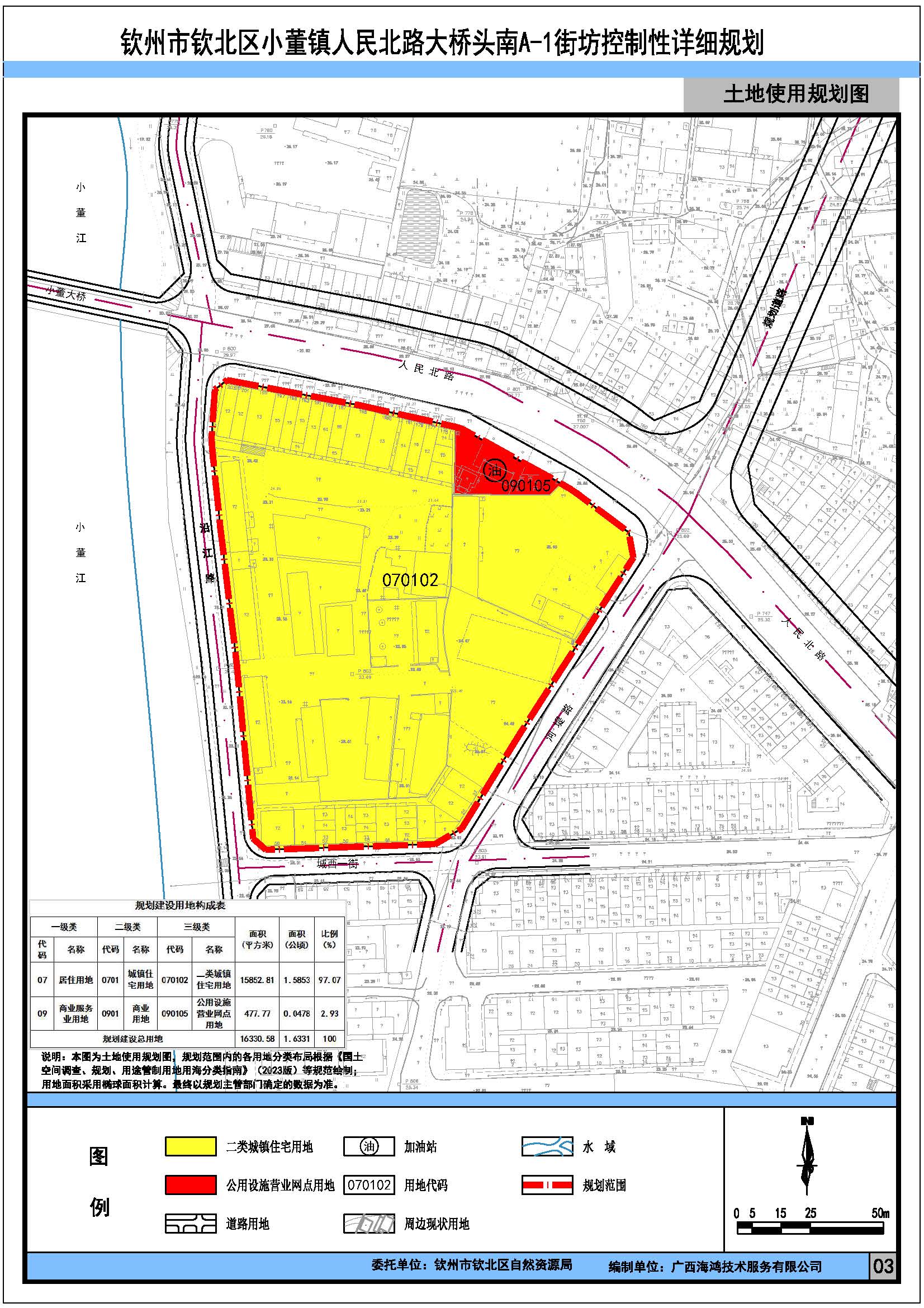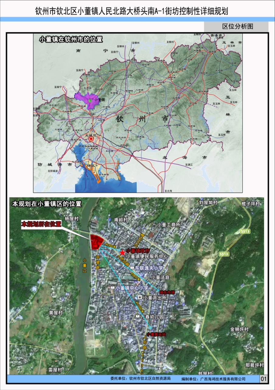 钦州市钦北区小董镇人民北路大桥头南A-1街坊控制性详细规划用地位于钦北区小董镇人民北路小董大桥南面,规划范围为:北面以人民北路为界,东部以河堤路为界,南面以城西一街为界,西部以沿江护堤路为界,规划用地面积约16330.58平方米(1.6331公顷)。目前该规划已编制完成,根据相关规定,2025年10月29日我局按程序组织召开了专家论证会,会议认为该项目规划在政策上、技术上可行,并符合国土空间规划和相关规定,原则同意该详细规划。
