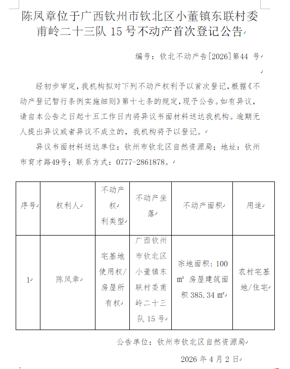 陈凤章位于广西钦州市钦北区小董镇东联村委甫岭二十三队15号不动产首次登记公告