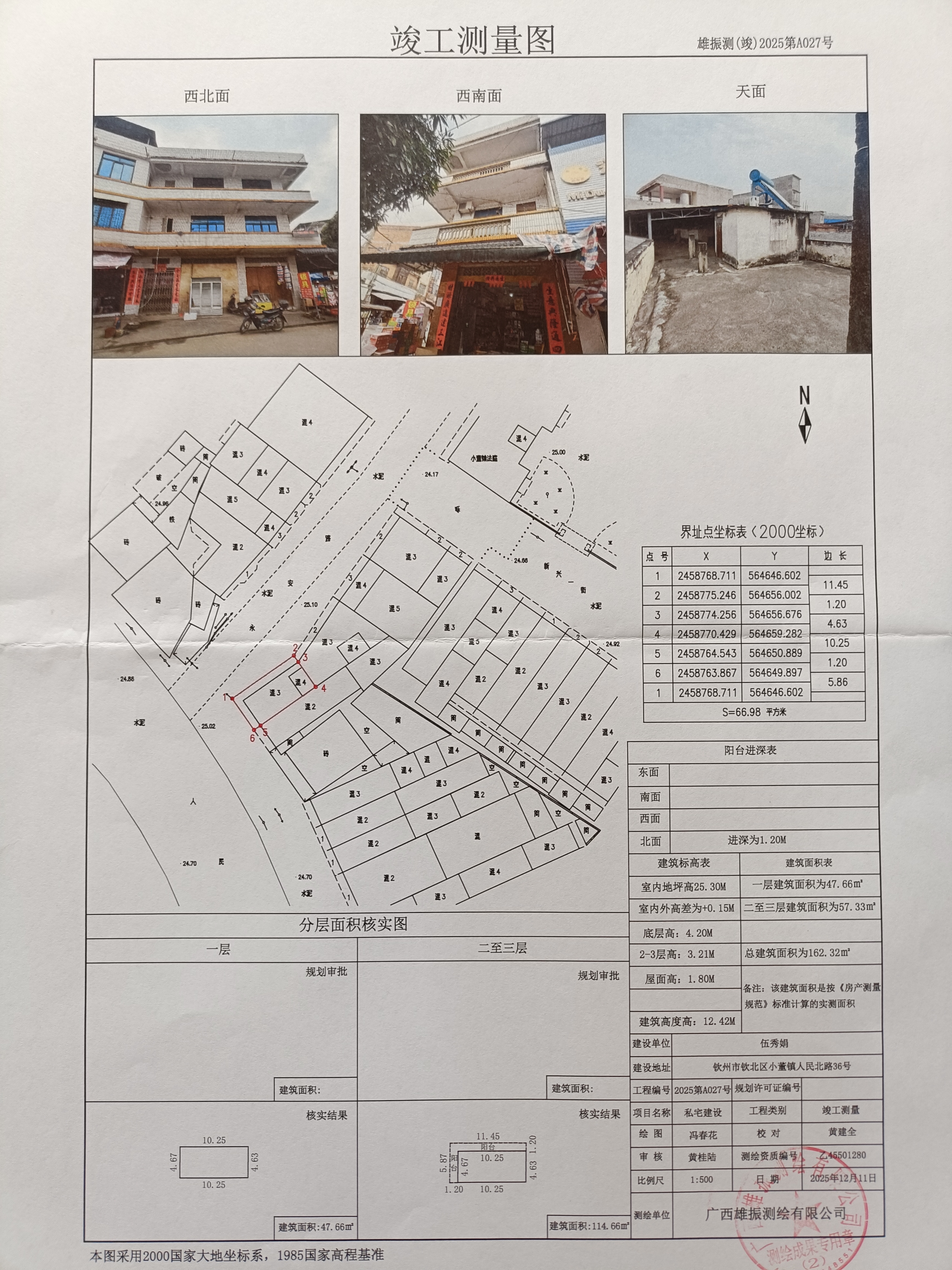 该房屋底层已取得不动产权证,证号:桂(2025)钦州市不动产权第0037184号,用地面积为47.66平方米,并取得一至二层《房产所有权证》(桂钦董字第10号),审批建筑面积97.57平方米,该户实建面积162.32平方米,实建较原审批多64.75平方米,为房屋第三层未取得《建设工程规划许可证》。