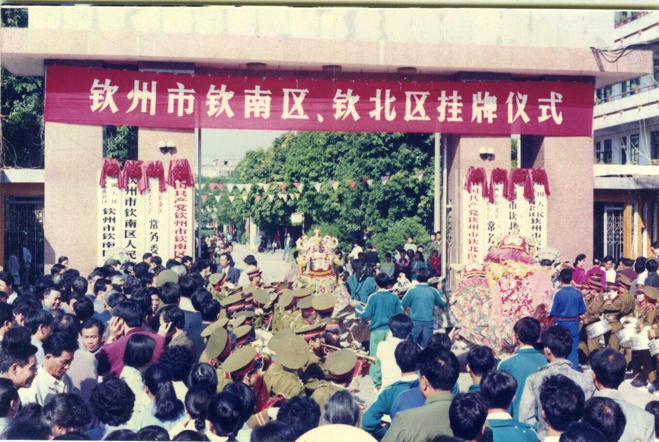 1994年10月28日,钦州市钦南区、钦北区举行挂牌成立仪式。图为挂牌仪式