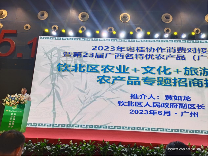 为充分利用2023年粤桂协作消费对接活动暨第23届广西名特优农产品(广州)交易会平台,更好地推介钦北区及钦北特色农产品,6月16日,2023年粤桂协作消费对接活动暨第23届广西名特优农产品(广州)交易会开幕式及系列活动在广州市隆重举行。钦州市钦北区人民政府副区长黄如龙率队参加活动并代表钦北区人民政府在会上就钦北区农业+文化+旅游产业作专题招商推介发言,通过生动的演示文稿讲解,向参加活动的企业嘉宾及领导全方位地宣传钦北区名特优农产品的优质形象。
