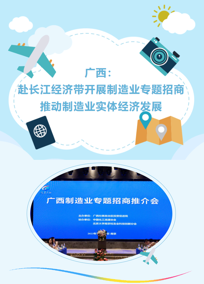 为加快推进广西与长江经济带的重点产业合作,推动中国—东盟产业合作区建设,助力制造业高质量发展,7月4日—8日,自治区投资促进局党组书记、局长黄卫平率队赴江苏、浙江围绕化工新材料、生物制药、制鞋等制造业开展专题招商和调研活动,并举办“投资广西—广西制造业专题招商推介会”,南京诺令生物科技有限公司、镇江桢元科技有限公司、江苏炼兴新材料有限公司、江苏省独角兽瞪羚企业联盟等33家江苏强优企业、专精特新企业以及行业协会应邀出席推介会。