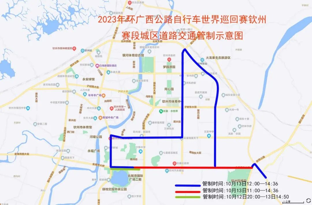 2.2023年10月13日10时25分起,对比赛线路:国道G325线664公里+500米(钦州与合浦交界)至698公里+200米(黎合江路口)全幅封闭,禁止一切与赛事无关车辆、行人通行,预计13时15分解除管制。