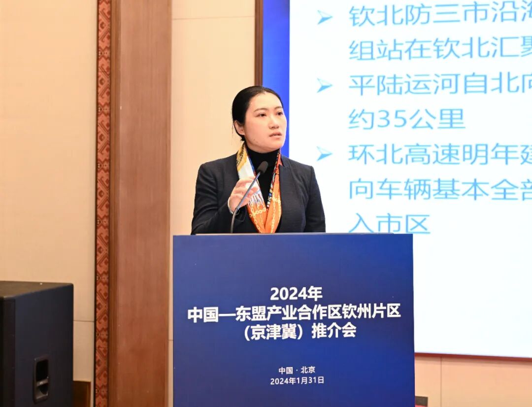 会上,邓洁丽围绕沿边临港产业园区、中国东盟产业合作区和平陆运河经济带的开发建设,详细介绍钦北区基本情况、重点招商引资方向、投资合作产业园区及可享受的优惠扶持政策等内容。她表示,近年来,钦北区坚持稳字当头、稳中求进,重实效、强实干、抓落实,充分利用中国-东盟产业合作区、沿边临港产业园区及平陆运河经济带等重大工程建设优势,抢抓机遇,乘势推动县域经济高质量发展,招商引资成果丰硕。同时,钦北区坚定不移推进高水平开放,以高质量服务保障重大项目建设,科学谋划平陆运河沿线(钦北段)建设,统筹推进平陆运河沿线经济带“六个一”项目,着力完善园区精细化工及上下游产业链,为加快建设高质量发展、高水平开放、高品质生活的滨海运河城市贡献钦北力量。