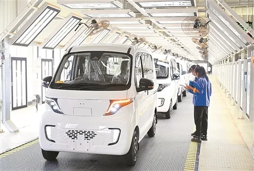 资料图片:在柳州五菱新能源汽车有限公司交付车间,工人正在检查即将出口的新能源物流车。通讯员 黎寒池 摄