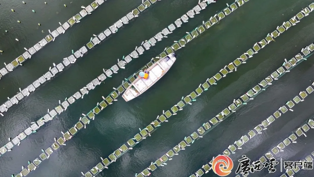 6月3日,在钦州市钦北区平吉镇八仙坝淡水珍珠养殖基地内,波光粼粼,一个个塑料瓶漂在水上,下方挂着培育珍珠蚌苗的网箱。放眼望去,横平竖直、串珠成线,勾勒出一幅规整而美丽的画卷。取蚌工人周德平熟练地划着小船,穿梭在这片水域间,不时挑起网箱,仔细查看蚌苗的生长情况。