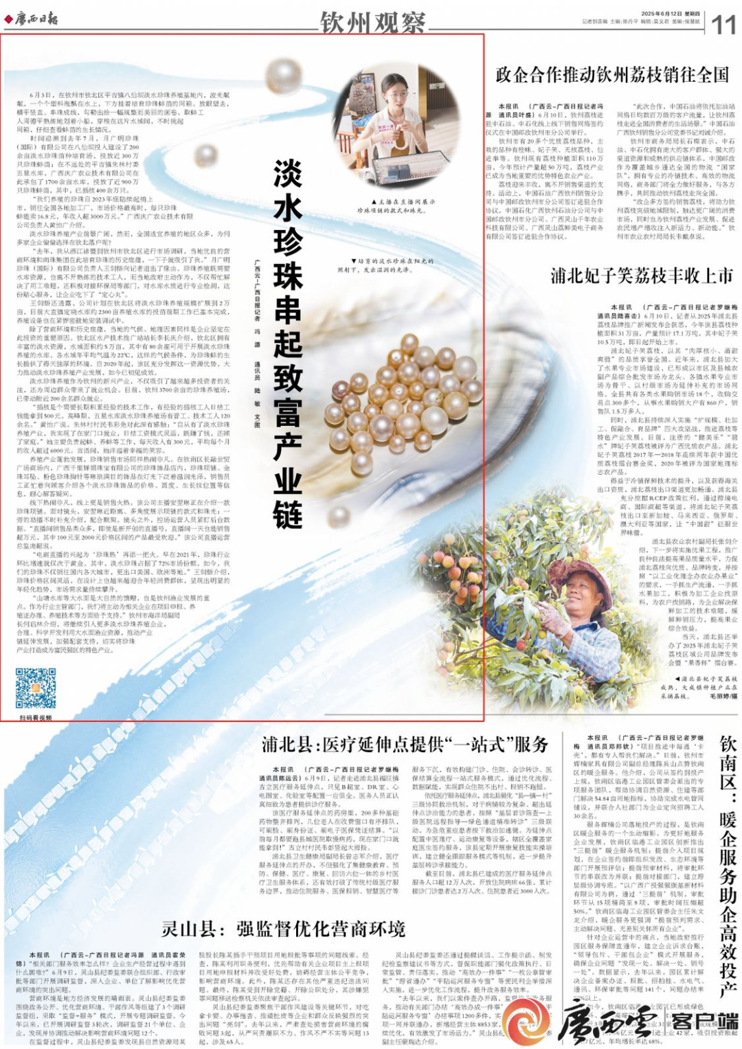 除了营商环境和历史底蕴,当地的气候、地理因素同样是企业坚定在此投资的重要原因。钦北区水产技术推广站站长李长庆介绍,钦北区拥有丰富的淡水资源,水域面积约5万亩,其中有80余座可用于开展淡水珍珠养殖的水库。各水域年平均气温为22℃,这样的气候条件,为珍珠蚌的生长提供了得天独厚的环境。自2020年起,该区充分发挥这一资源优势,大力推动淡水珍珠养殖产业发展,如今已初见成效。