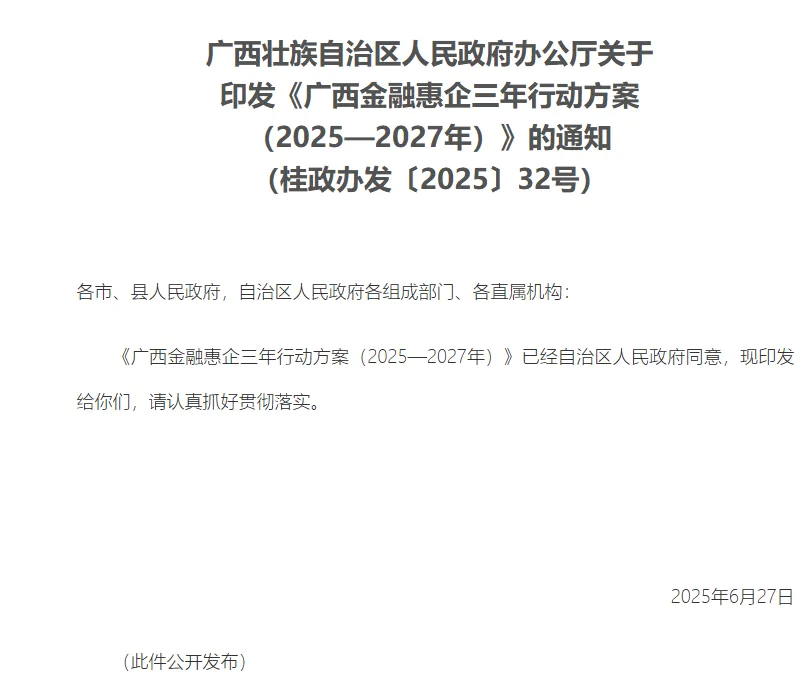 日前,自治区政府办公厅印发《广西金融惠企三年行动方案(2025—2027年)》,强化金融政策和科技、产业、财税等政策衔接配合,统筹用好股权、债权、保险、融资担保等金融工具,综合运用贴息、奖补、风险补偿等政策工具,服务重大项目、重点产业和普惠领域,助力全区加快高质量发展。《方案》提出,到2027年,广西力争统筹各类财政资金75亿元,带动全区财政贴息贷款投放6000亿元以上、补贴融资担保业务1000亿元以上、发行债券3000亿元以上。