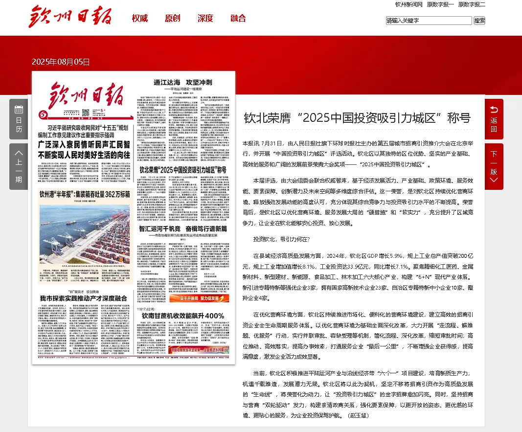 7月31日,由人民日报社旗下环球时报社主办的第五届城市招商引资推介大会在北京举行,并开展“中国投资吸引力城区”评选活动。钦北区以其独特的区位优势、坚实的产业基础、高效的服务和广阔的发展前景荣膺大会奖项——“2025中国投资吸引力城区”。