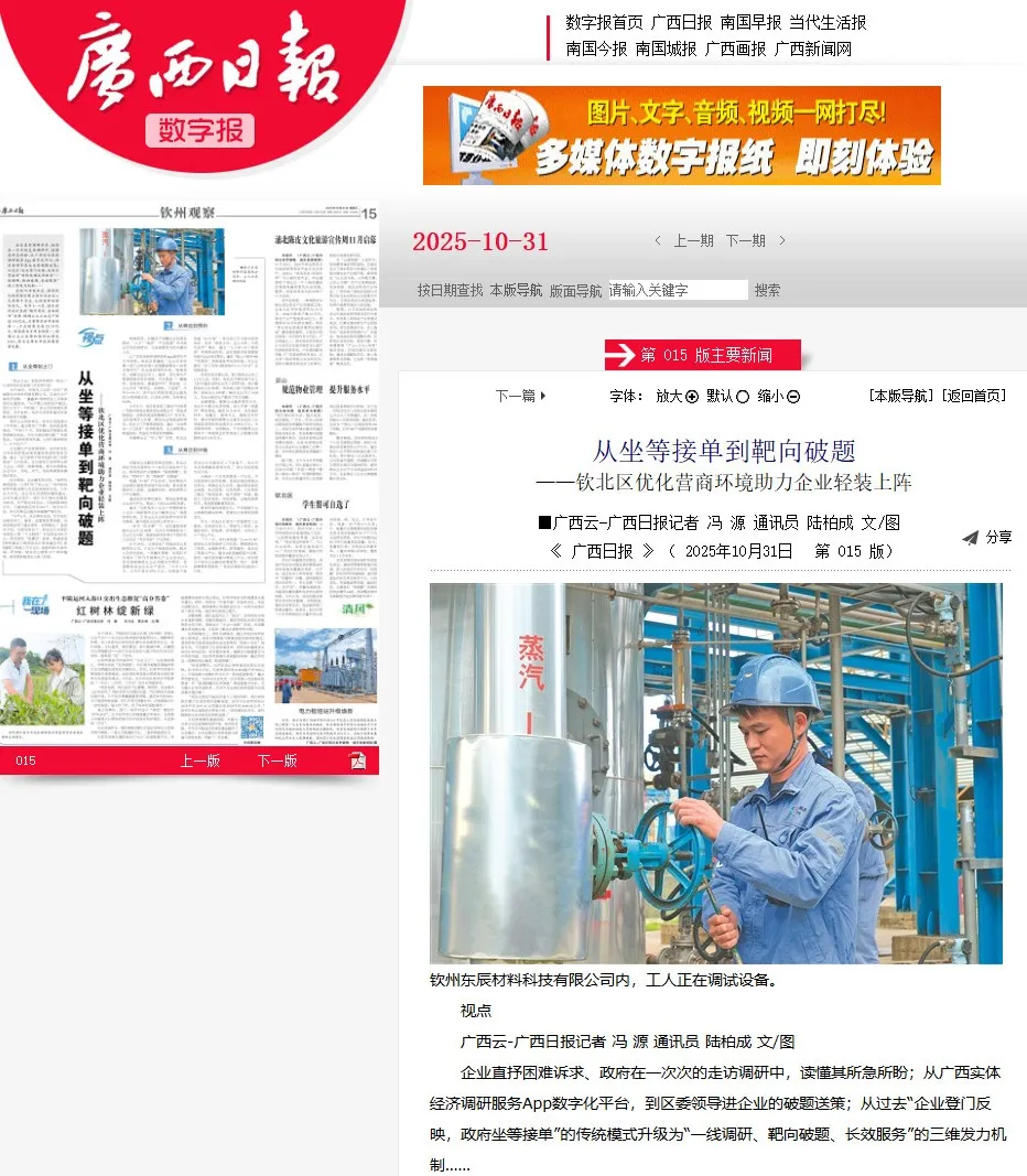 走访成效,企业最有发言权。“政府的靠前服务,让我们吃了定心丸。”钦州东辰材料科技有限公司总经理谢培华说,今年10月中旬,该公司已完成项目整体建设,正在申请试投产。预计年产催化剂载体1500吨、年产值达5.5亿元、年纳税额2500万元,可提供就业岗位200个,能为中石油、中石化等企业提供高端国产催化剂。