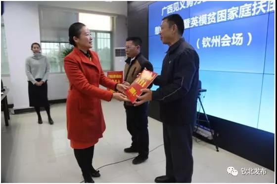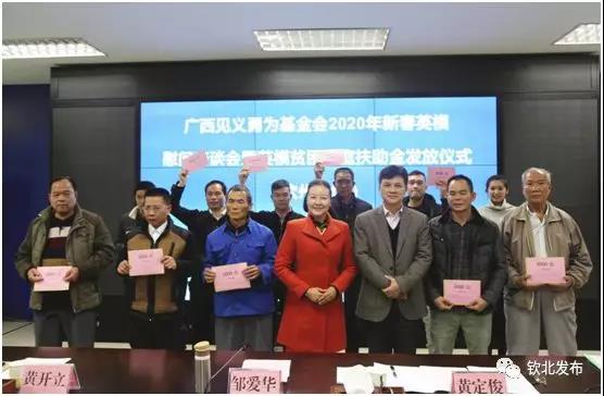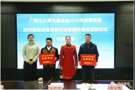 12月26日,广西见义勇为基金会副理事长邹爱华率领自治区2020年新春慰问工作组到钦州市开展新春英模慰问活动,座谈会暨英模贫困家庭扶助金发放仪式在钦北区举行。市委政法委副书记黄定俊,各县区委政法委相关领导同志参加活动。
