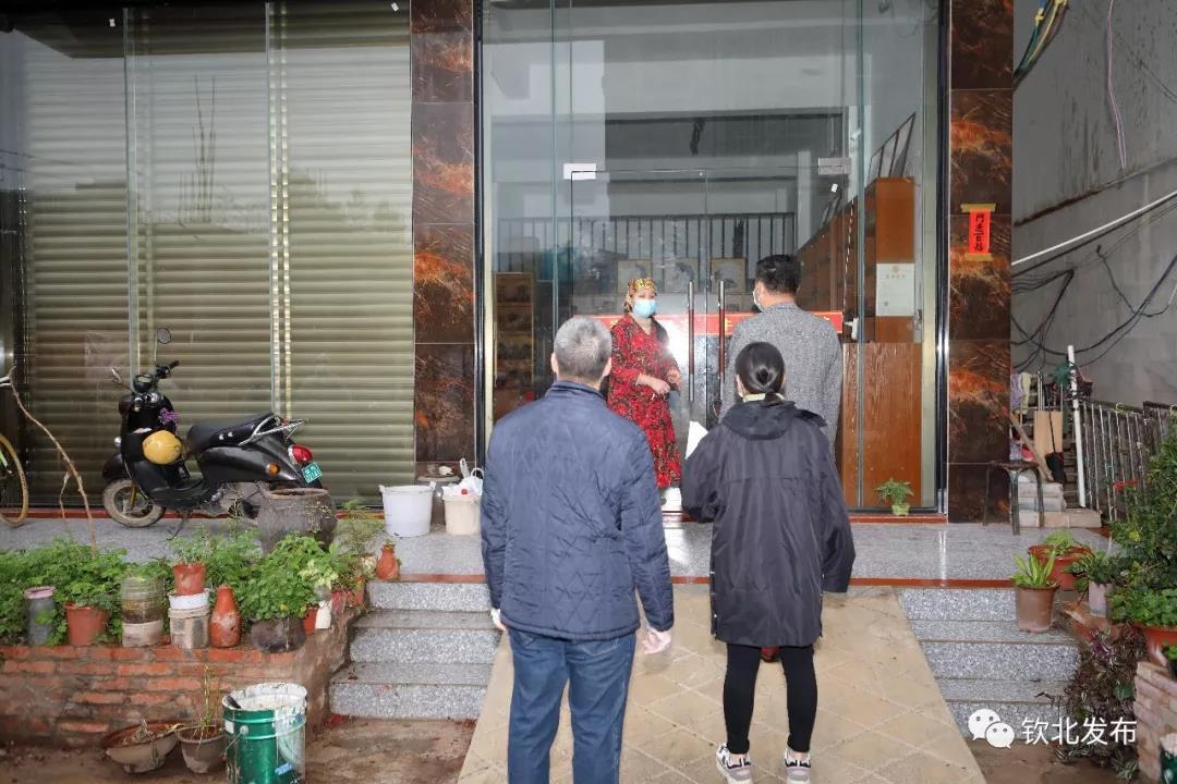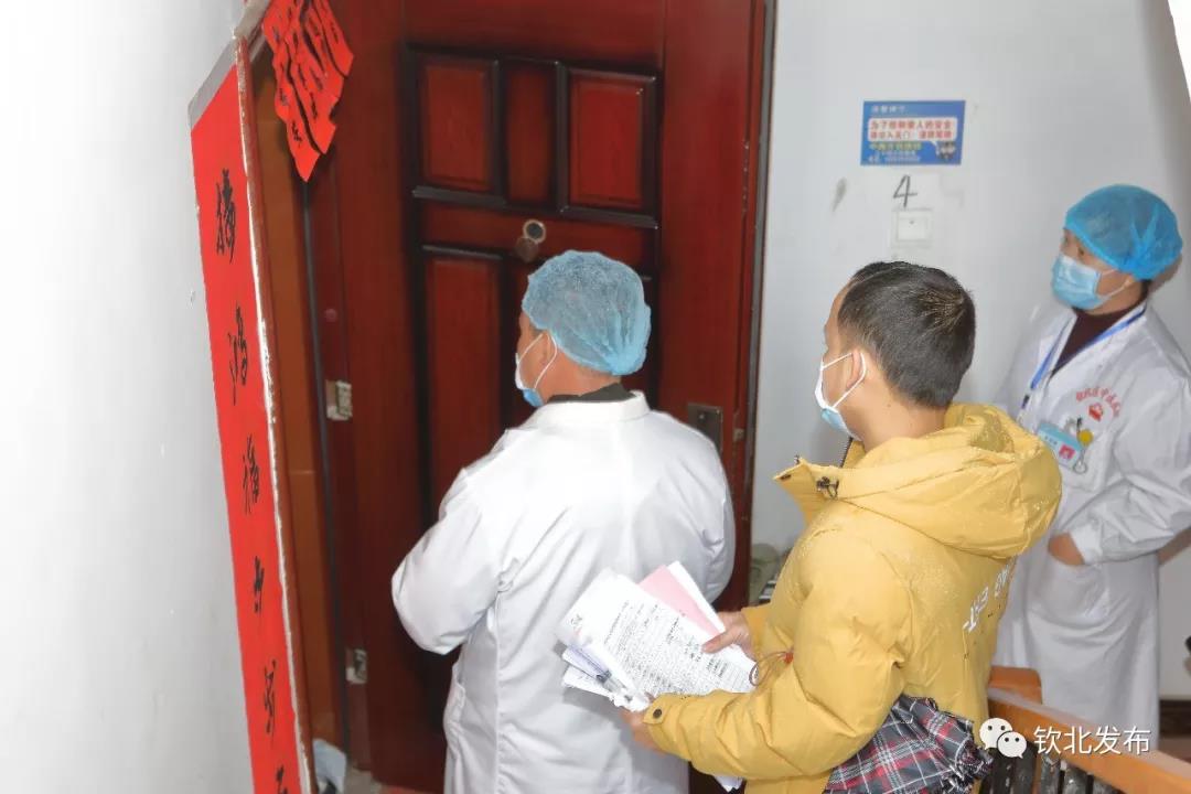 △钦北区中医院党支部党员在长田街道大井社区入户走访湖北回钦人员