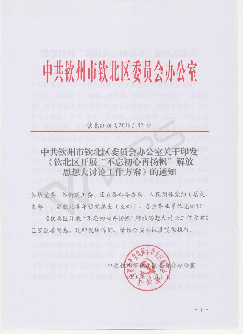 关于印发《钦北区开展“不忘初心再扬帆”解放思想大讨论工作方案》的通知(钦北办通【2018】47号