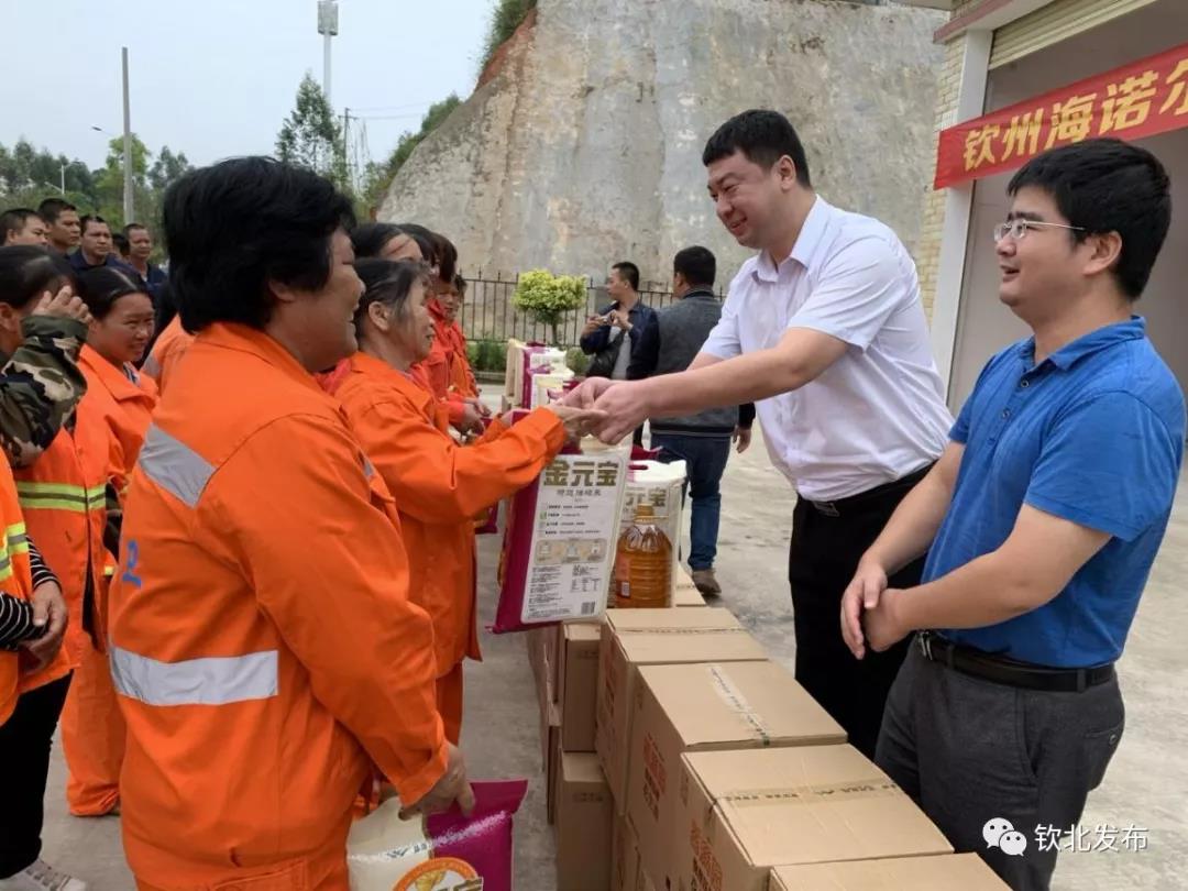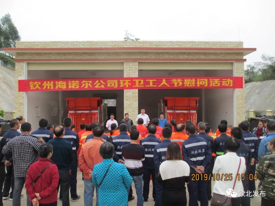 广西“环卫工人节”设立23周年纪念日即将到来之际,为表示对环卫工人的关爱,10月25日,区住建局携手钦州海诺尔环保发电有限责任公司、广西钦州源众科技有限公司两家爱心企业到钦北区环宇中转站对区环卫站环卫工人进行节日的问候,向环卫工人捐赠价值2万元的慰问物品。