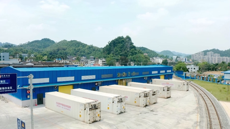 装有东盟水果的冷链专列驶入国铁凭祥口岸物流中心。刘雅琴摄