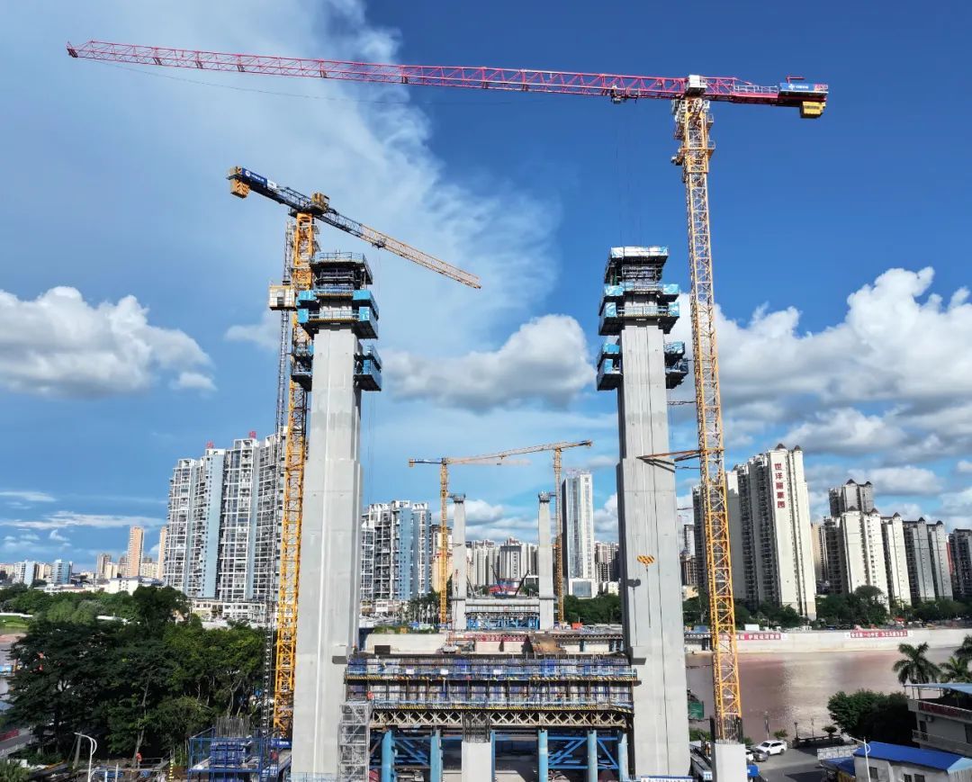 大桥主塔总高70.5米,全塔混凝土用量达5991立方米,钢筋用量超过1600吨。目前,主塔已完成60.2米混凝土段施工。