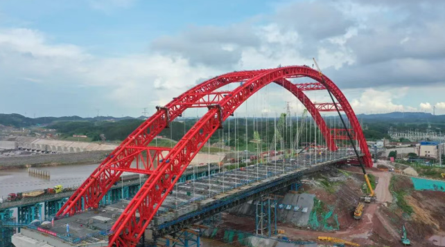 平陆运河G325广南线钦江大桥主梁由钢格梁与钢混组合桥面板构成,格子梁采用主、次纵梁与主、次横梁共同组成的格子体系,整体结构稳固、技术先进。全桥格子梁总用钢量达3039吨,共分37个节段进行安装,最大吊重达115.7吨。施工过程中,平陆运河建设管理团队针对不同区段采取差异化吊装方案:无索区及有索区陆域段采用履带吊原位吊装;有索区跨河段则通过搭设滑移支架,分节段由东岸滑移至设计位置后顶升就位。东西两岸同步施工,有效保障了拱肋吊装过程中的结构受力均匀与整体稳定性。